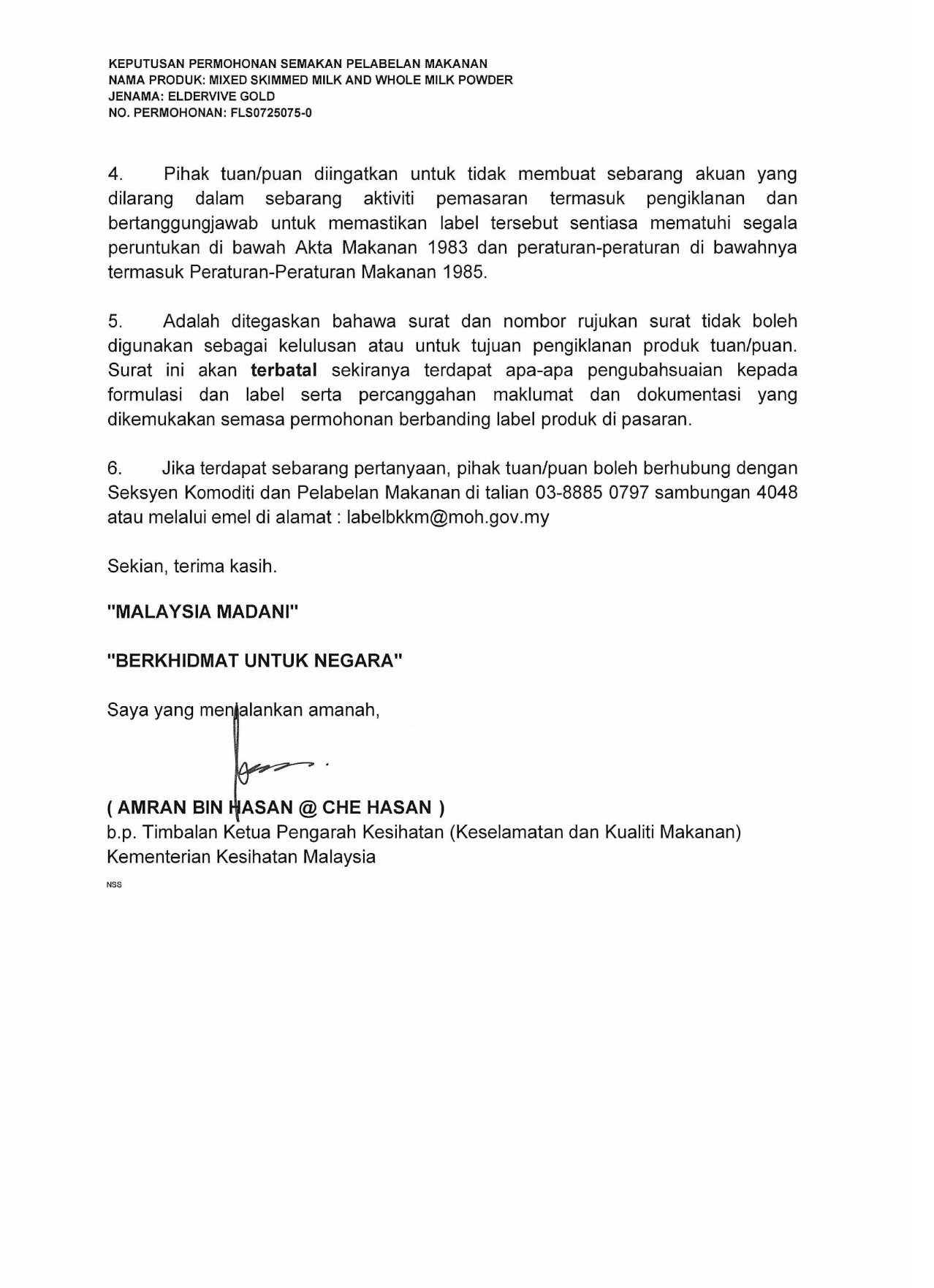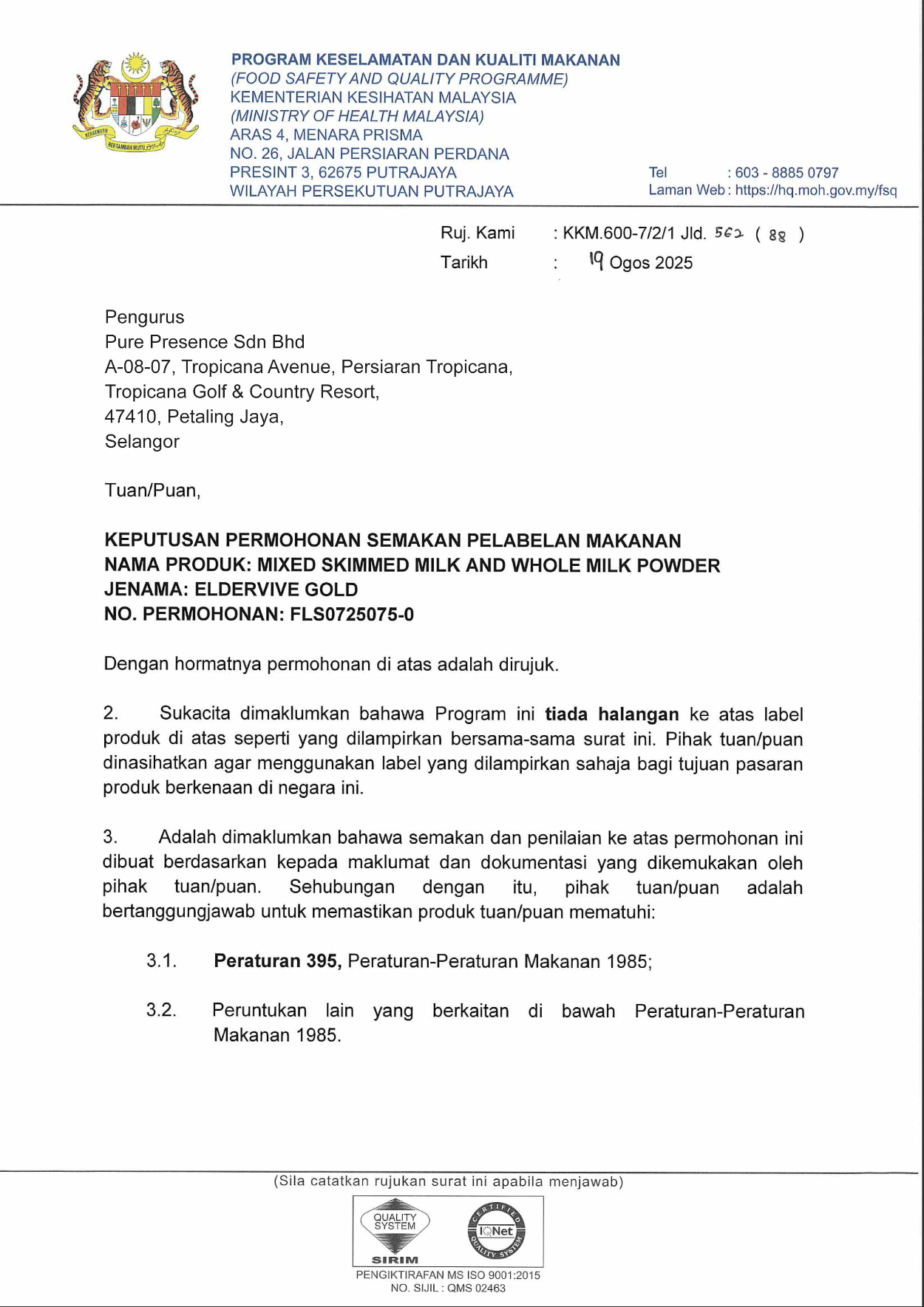 Eldervive Gold is certified by MESTI KKM, GMP, FDA, ISO, and HACCP, crafted with uncompromising quality and reliability for your health.